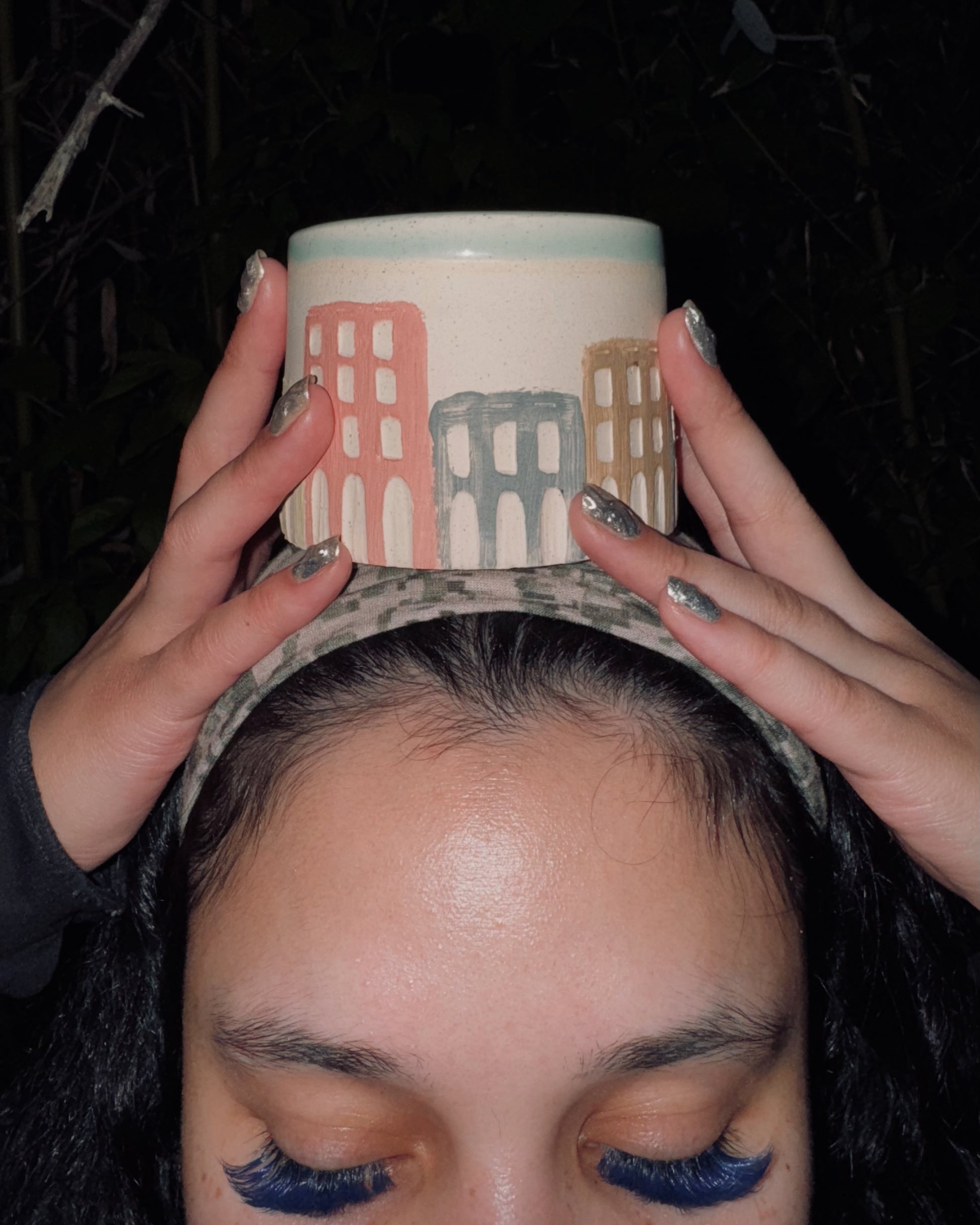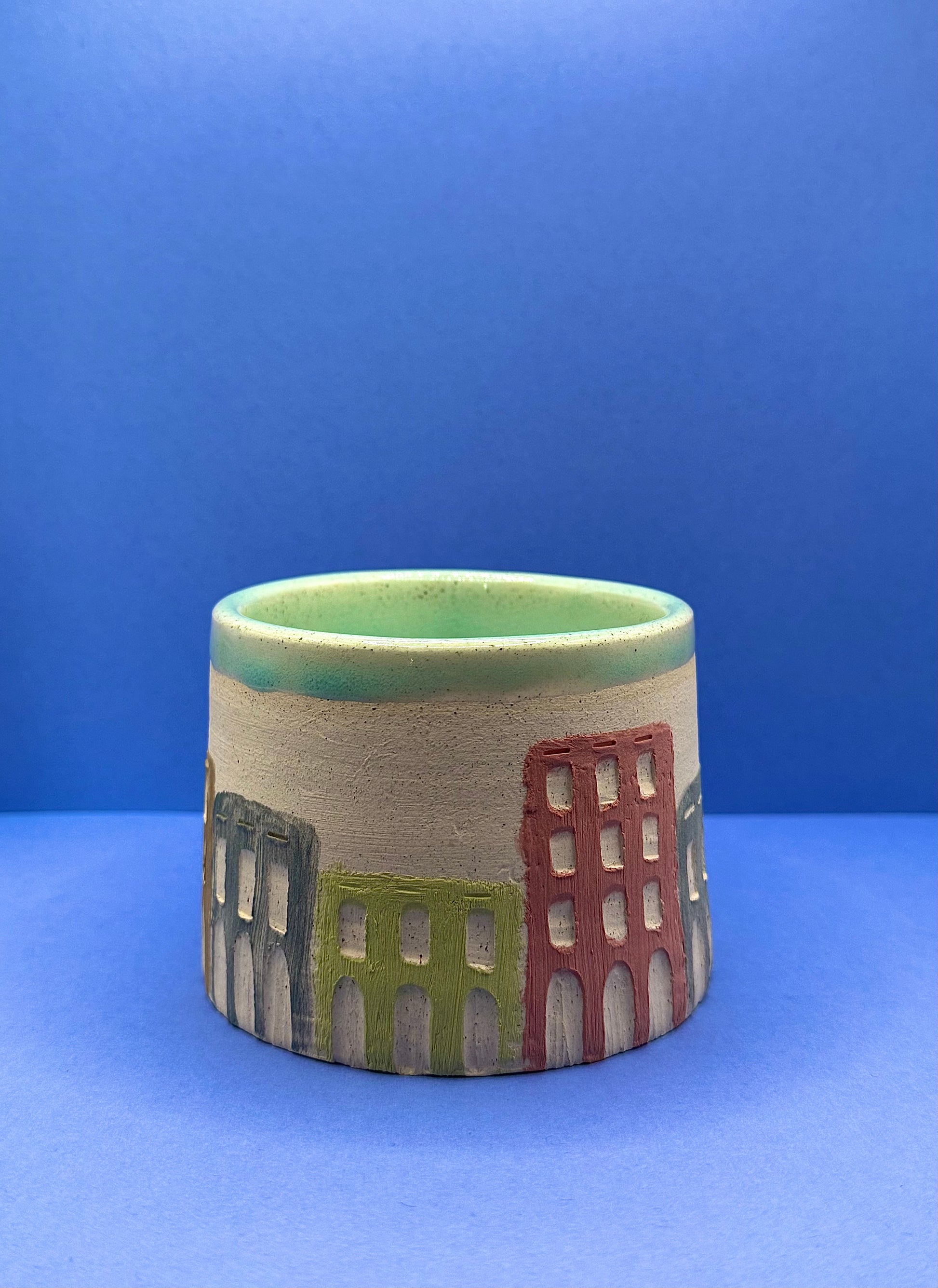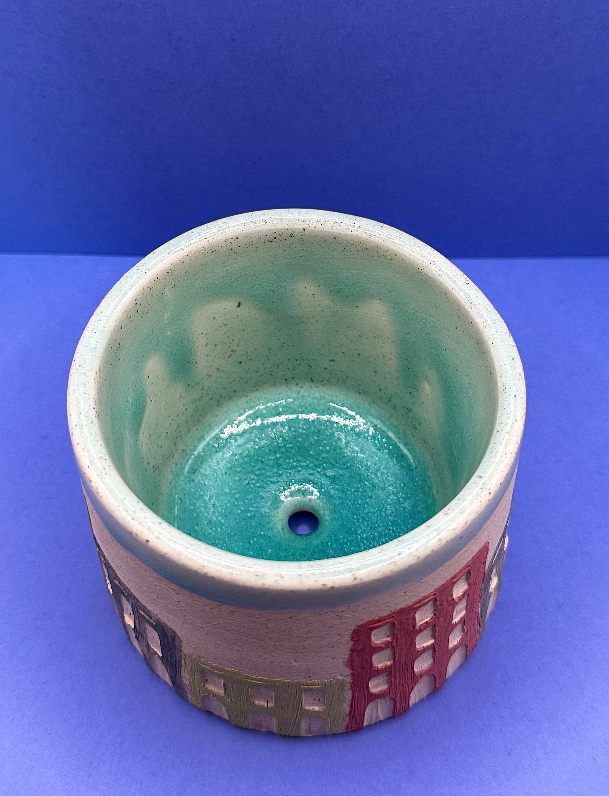 Wrapped in colorful hand-painted rowhouses and finished with a glossy blue glaze inside, this planter is inspired by the vibrant homes of the Caribbean. It stands 3" tall and features a drainage hole, perfect for your favorite succulent or small plant.